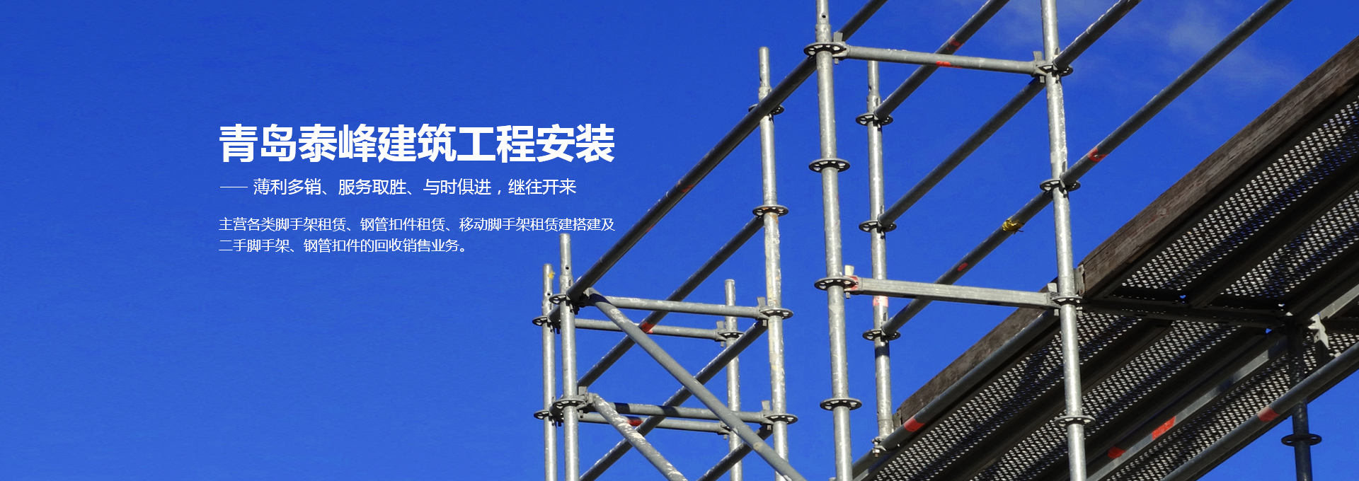 青島泰峰建筑工程安裝有限公司主營各類腳手架租賃、鋼管扣件租賃、移動腳手架租賃建搭建及二手腳手架、鋼管扣件的回收銷售業(yè)務。公司實力雄厚,擁有鋼管約3000噸、扣件70萬只、鋼笆7萬多片塔吊、人貨電梯多臺;總資產達到1000多萬元。是一家具有腳手架搭建、水電安裝專業(yè)承包施工資質的企業(yè),并成為青島市五金協會的會員單位。且多次參與高層建筑、建筑裝修、玻璃幕墻、橋梁、隧道、地鐵、電廠維修施工、造船等行業(yè)的施工,并獲得施工單位的一致好評。 人無信不立,有信則強公司以“薄利多銷、服務取勝”為經營宗旨...